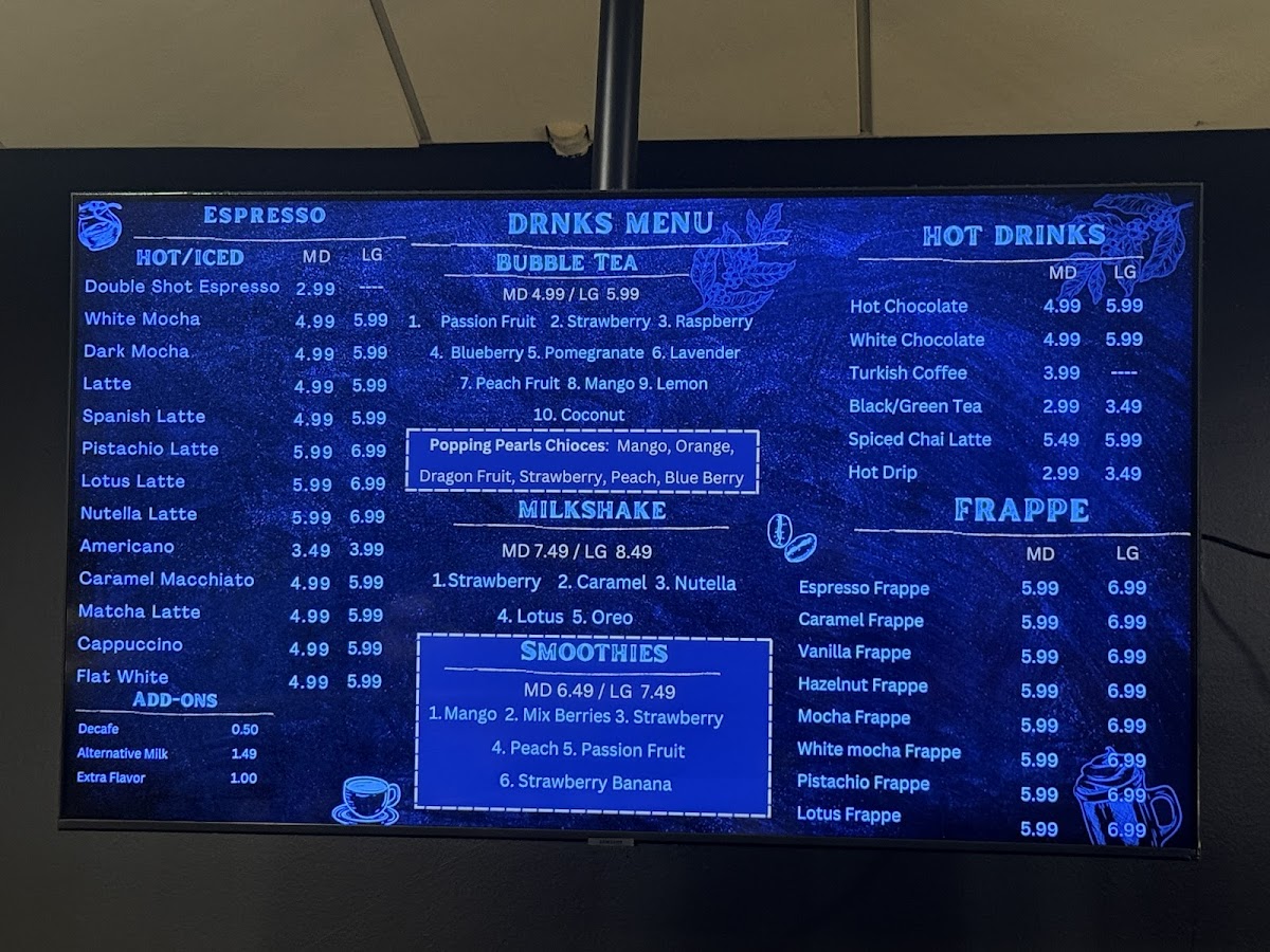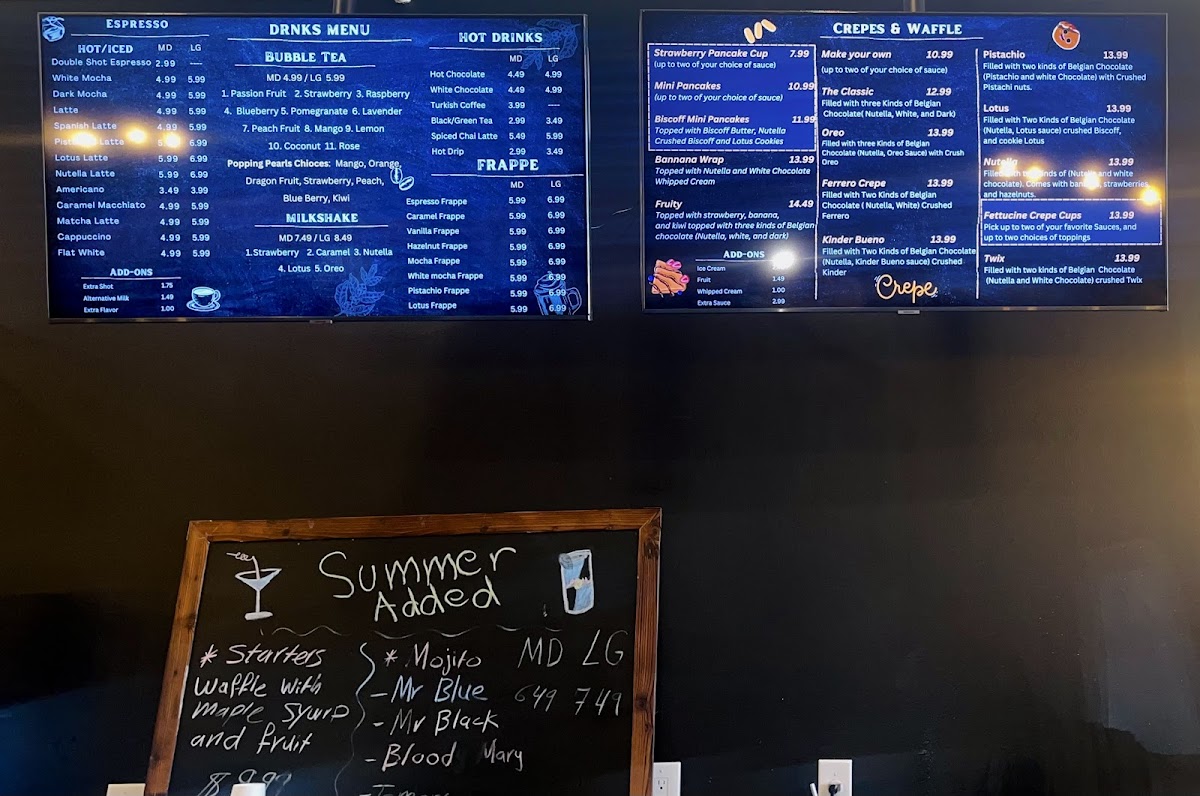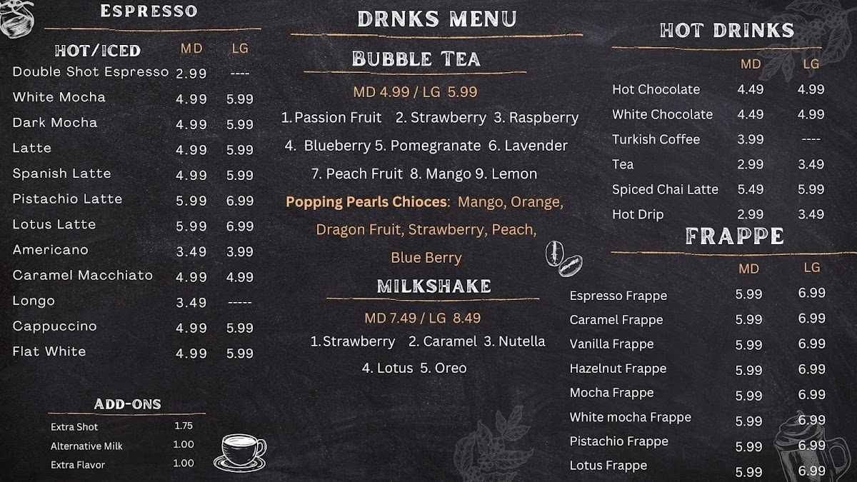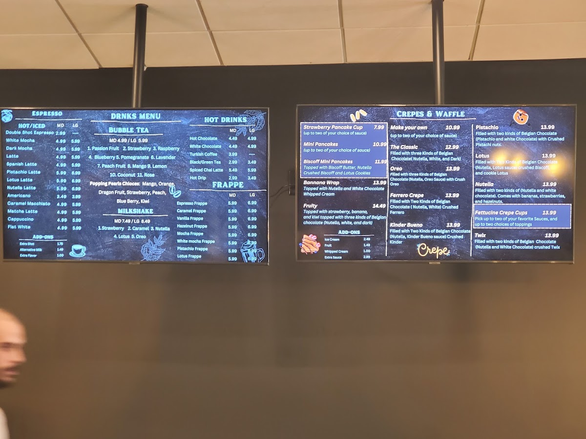 Coffee lovers will enjoy a selection of beverages, including the rich and smooth Flat White, ideal for a morning pick-me-up, or the indulgent White Mocha, which combines the sweetness of white chocolate with a velvety coffee base. If you're looking for something to pair with your crepe, the Coffee and Crepes combo offers a perfect blend of both worlds.